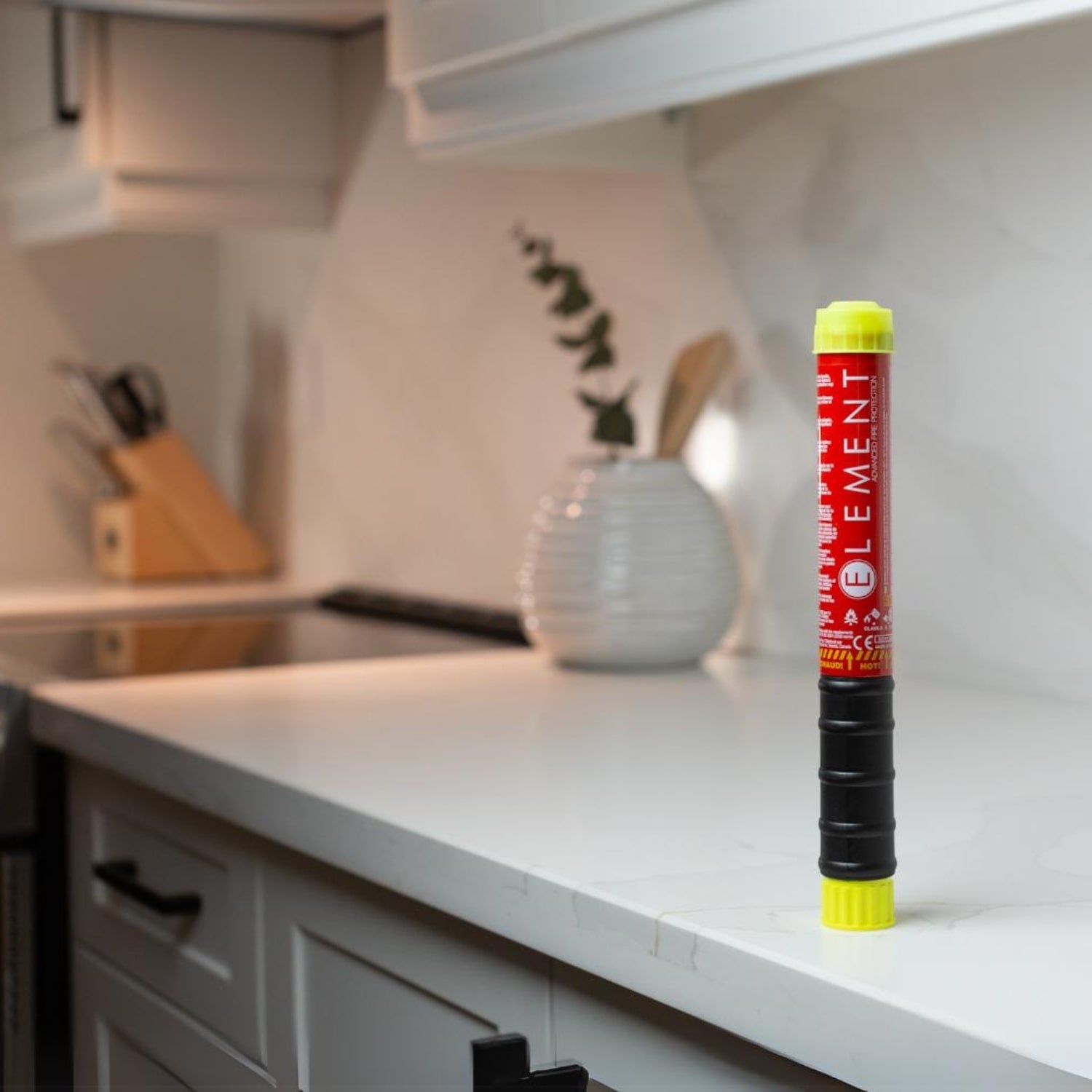 Element looks and works like nothing else. It fights fires on the molecular level by chemically interrupting the chain of combustion. Element safely and effectively puts out fires without the mess, toxicity, or maintenance associated with a traditional extinguisher.