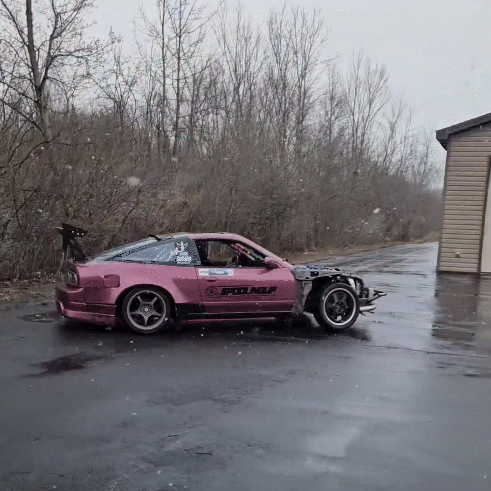 Marvel at the track-ready Miata in this capture! It is seen fully equipped for track day as it is tricked out with four spare tires mounted on its back to signal its readiness for the intense races ahead. The post also shows the eager anticipation of the drivers as they huddle and shiver at the drivers' meeting before the event. The scene is all set for a day of high-speed thrills on the track.